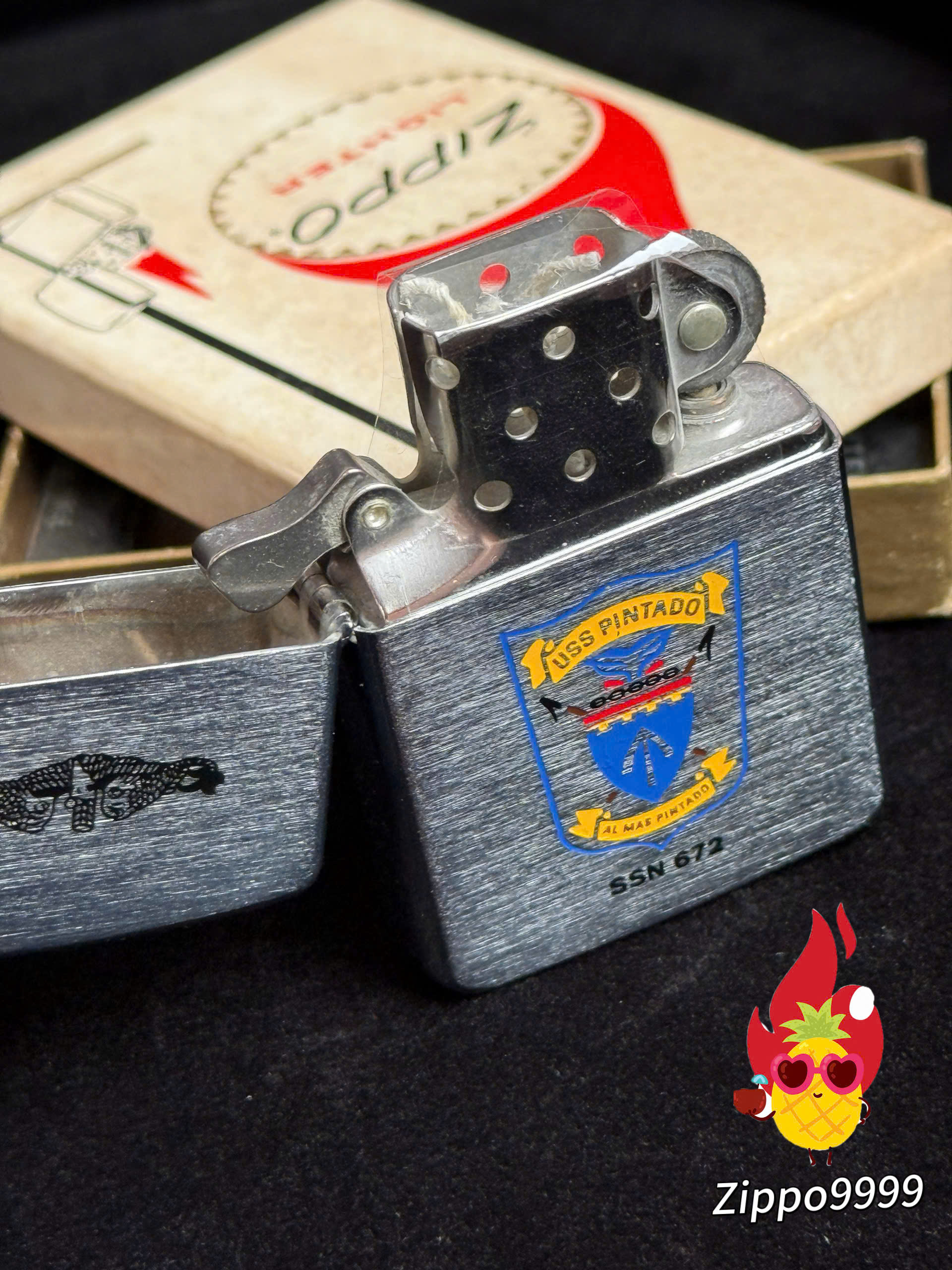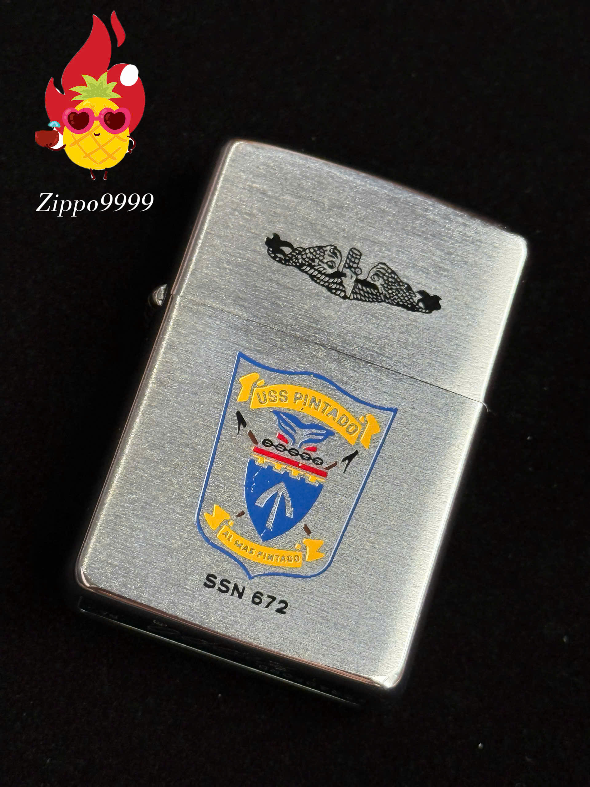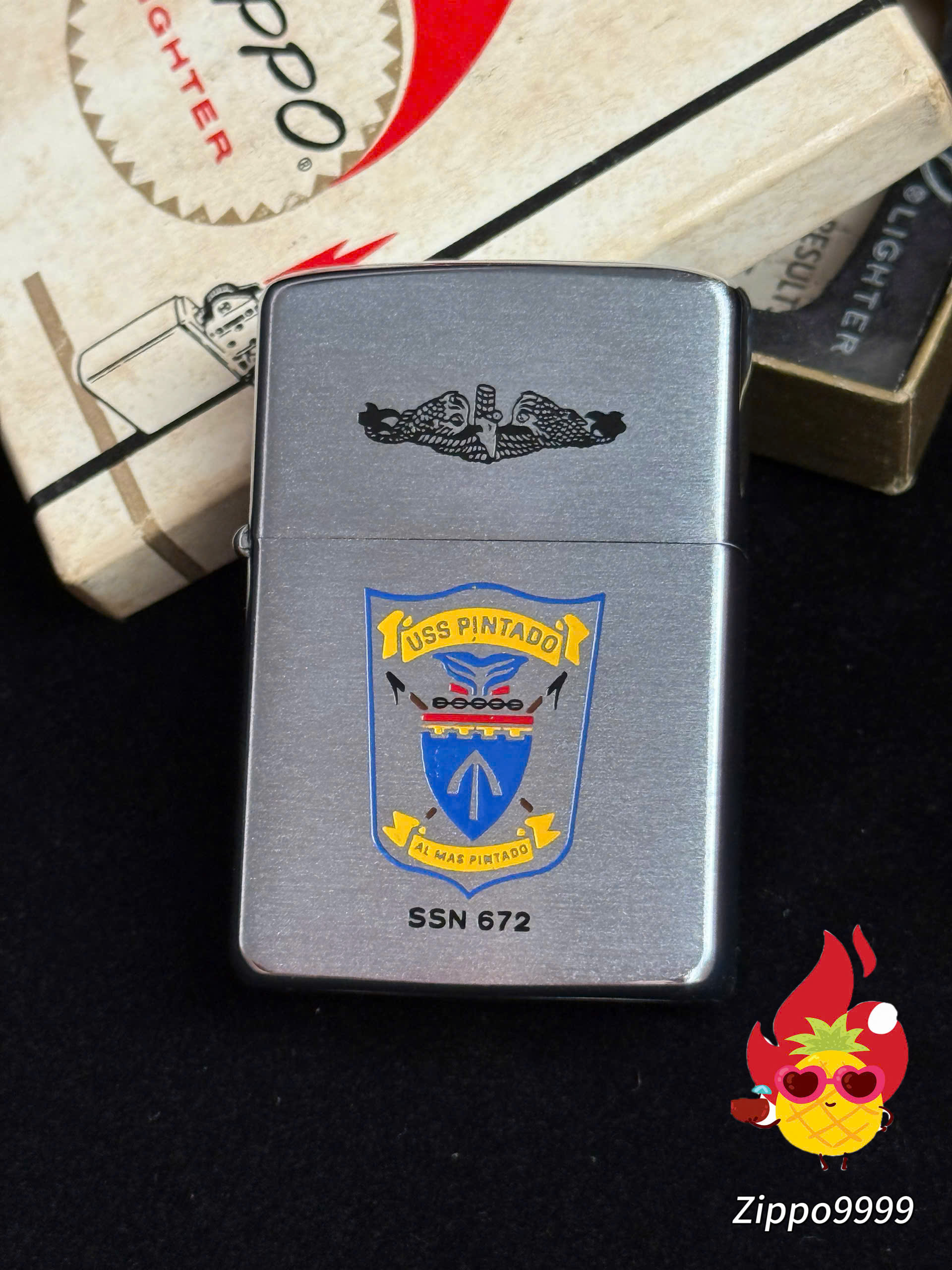 Chiếc Bật Lửa Zippo Chủ đề Tàu Ngầm Hạt Nhân đời 1973 này là phiên bản đặc biệt dành riêng cho thủy thủ đoàn tàu ngầm hạt nhân USS Pintado (SSN-672) – một tàu lớp Sturgeon thuộc Hải quân Hoa Kỳ. Mặt trước bật lửa được trang trí nổi bật với phù hiệu chính thức của tàu, cùng dòng chữ “Al Más Pintado”, mang ý nghĩa danh dự và lòng trung thành.