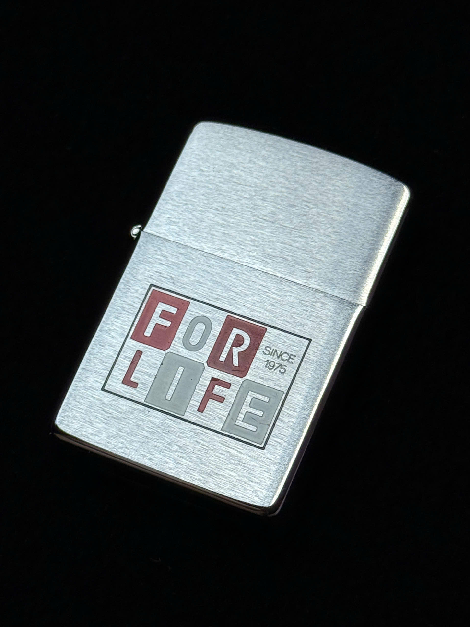 Mặt trước được trang trí bằng họa tiết chữ “FOR LIFE” với sự phối màu đỏ và xám, kết hợp hài hòa, mang thông điệp ý nghĩa về sự bền bỉ và gắn bó lâu dài. Đây là mẫu Zippo đặc trưng của thập niên 80, thể hiện sự hòa quyện giữa phong cách cổ điển và hiện đại, đồng thời là biểu tượng cho chất lượng và độ bền vượt thời gian của thương hiệu Zippo.