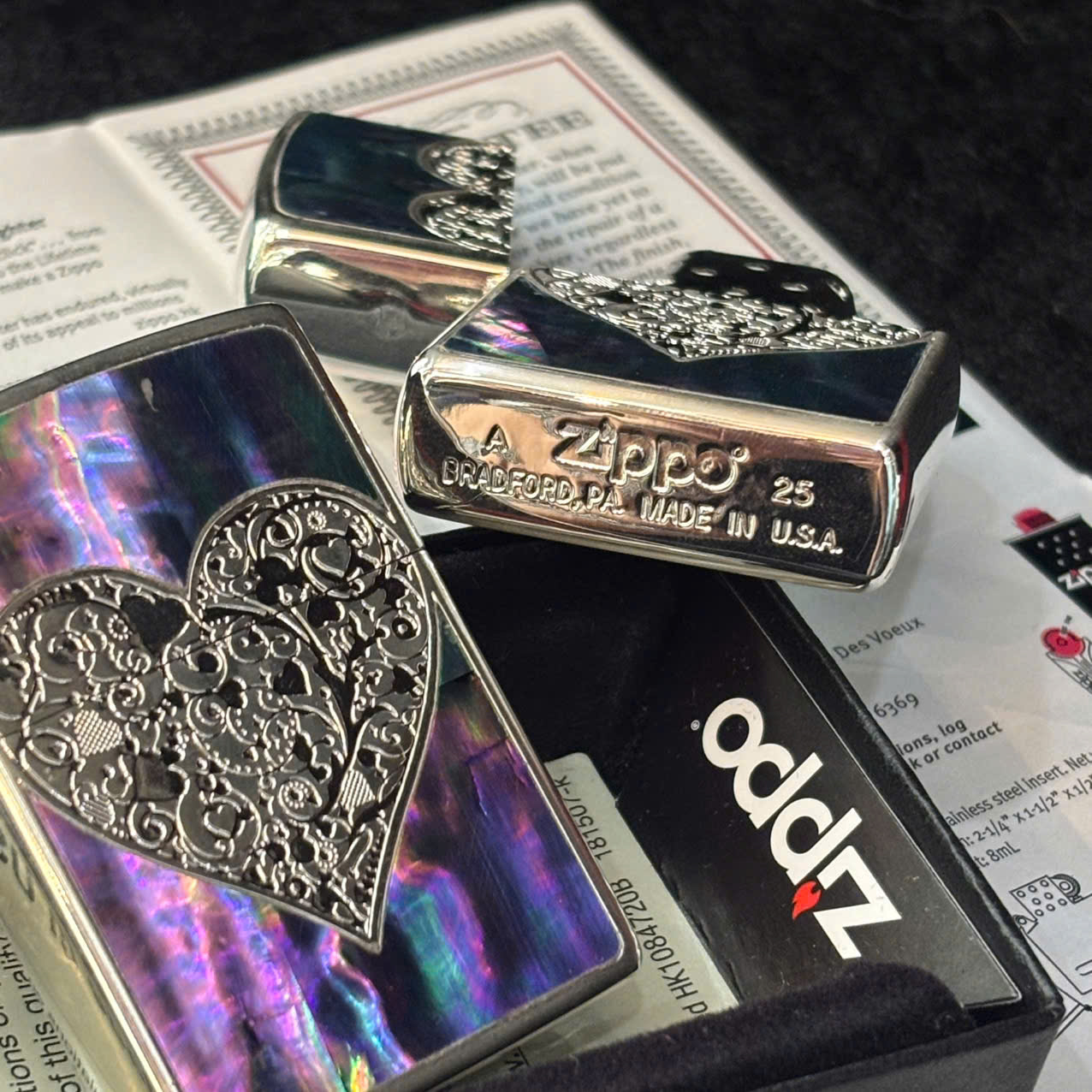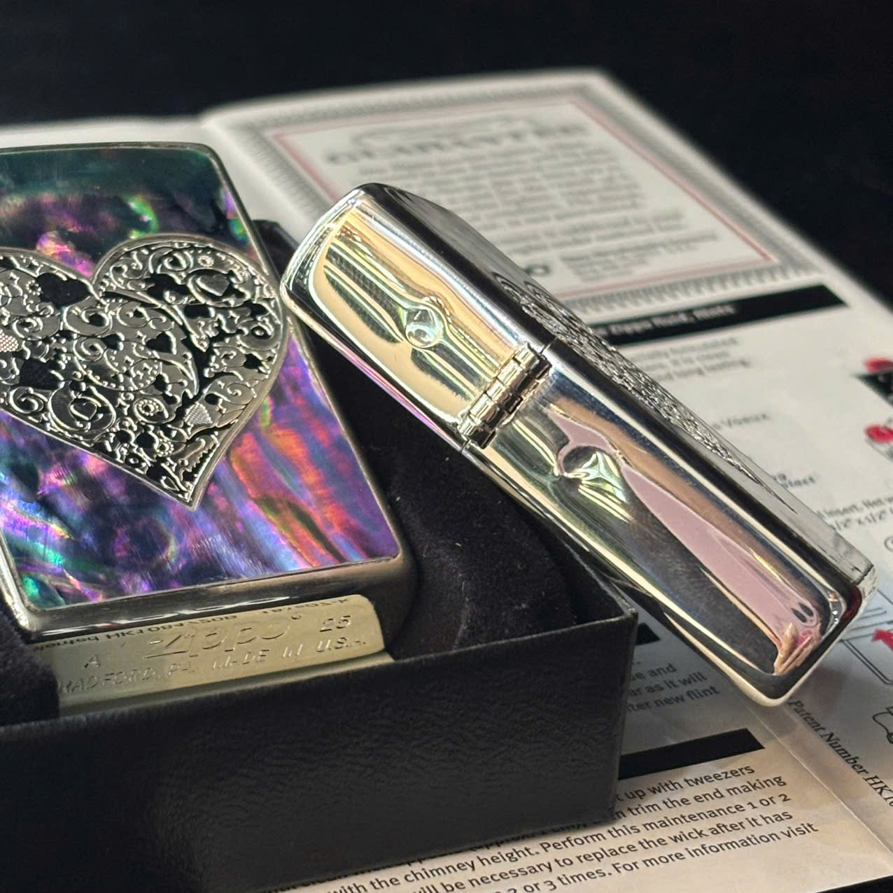 Chiếc Zippo này sở hữu vẻ đẹp lãng mạn và tinh tế với nền xà cừ óng ánh sắc màu huyền ảo, được tô điểm bằng họa tiết trái tim bạc chạm khắc hoa văn cầu kỳ. Sự kết hợp giữa ánh sáng lung linh và thiết kế tinh xảo mang lại cảm giác sang trọng, ngọt ngào, rất phù hợp làm món quà kỷ niệm đầy ý nghĩa.
