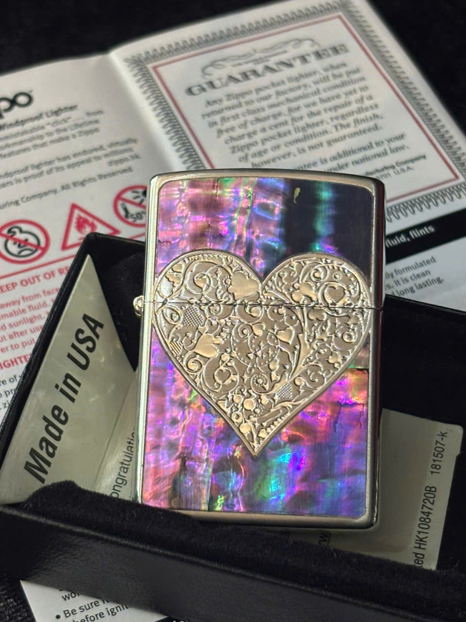 Đây là một chiếc bật lửa Zippo với thiết kế hình trái tim chạm khắc tinh xảo trên nền vỏ xà cừ óng ánh nhiều màu sắc.
