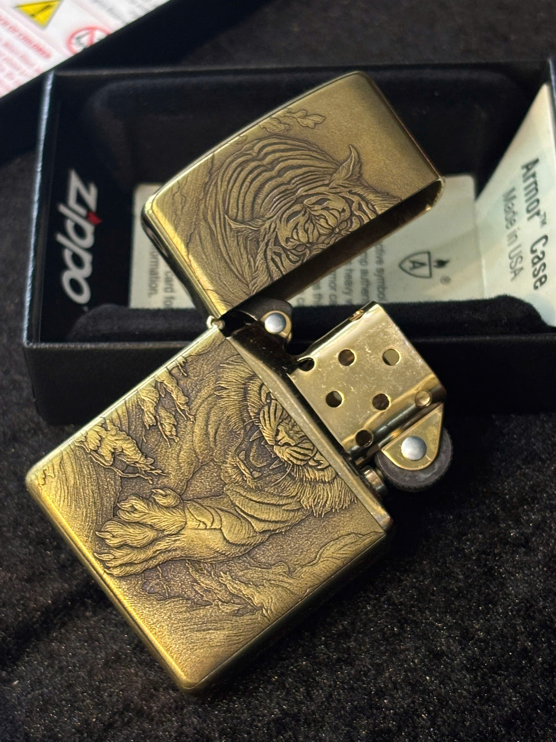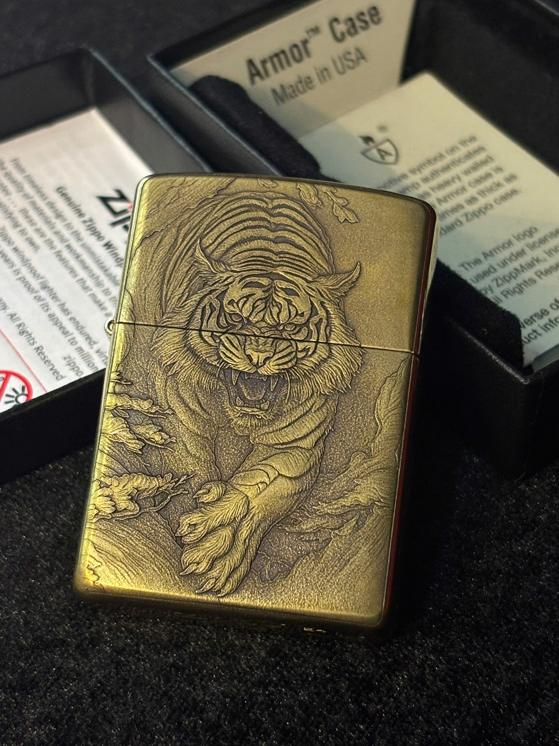 Trên nền đồng cổ trầm ấm, hình ảnh con hổ được khắc tỉ mỉ đến từng sợi lông, gân vuốt. Ánh nhìn sắc bén và dáng đi săn mồi khiến chiếc Zippo toát lên vẻ dữ dội, oai nghi. Một thiết kế mang đậm tinh thần dũng mãnh, thể hiện khát vọng chinh phục và sự tự tin của người sở hữu.