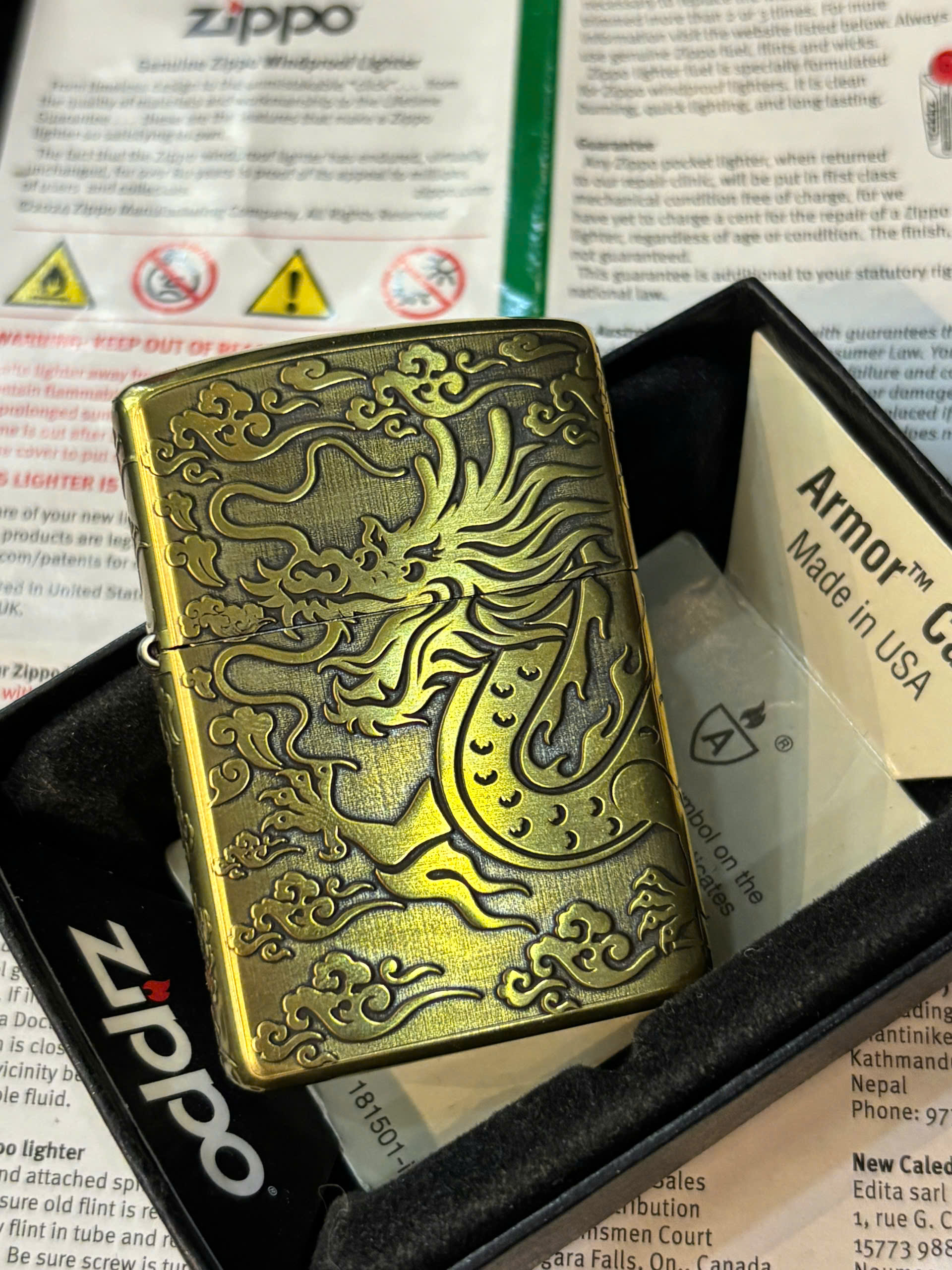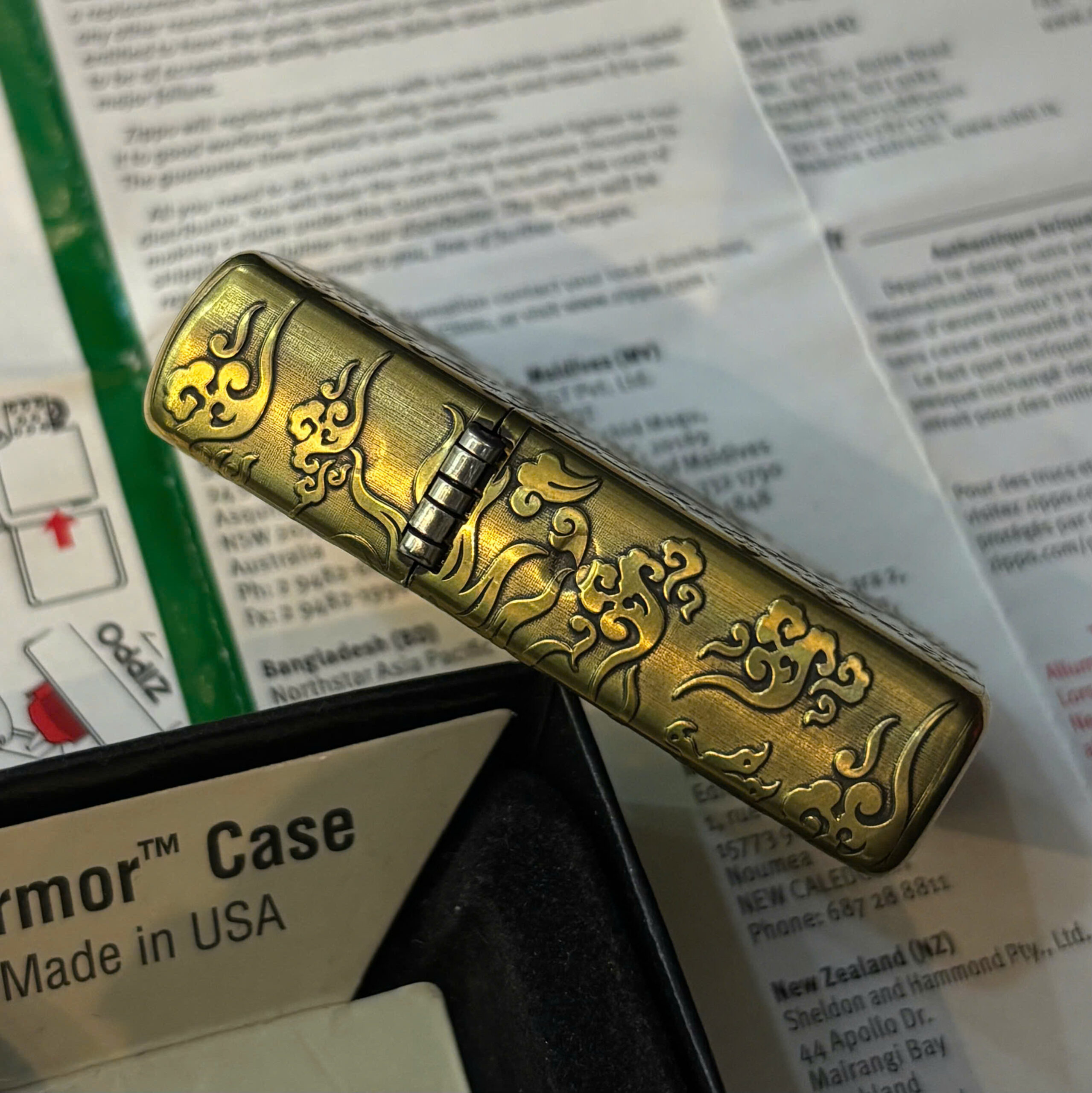 Zippo Armor™ khắc rồng nổi. Thân bật lửa làm bằng đồng thau phủ cổ (antique brass), mang lại cảm giác mạnh mẽ và cổ điển. Hình rồng uốn lượn giữa mây trời được khắc sâu tỉ mỉ, tượng trưng cho sức mạnh, quyền uy và may mắn trong văn hóa Á Đông. Dòng Armor có lớp vỏ dày hơn 1,5 lần so với Zippo tiêu chuẩn, giúp máy chắc tay và bền bỉ hơn trong quá trình sử dụng.